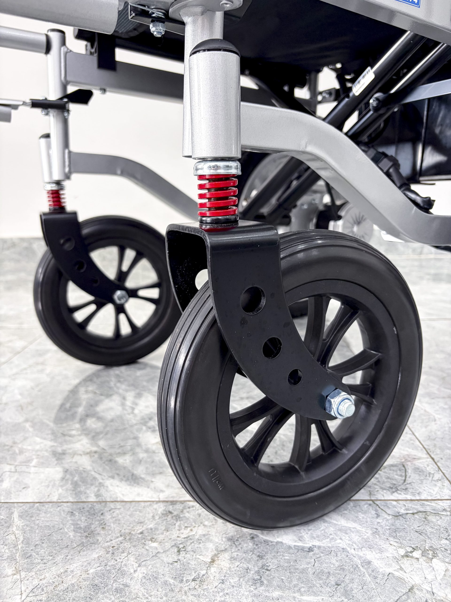 Phanh tay: Ngoài phanh điện, xe vẫn giữ phanh gạt tay ở hai bên bánh xe. Chức năng này dùng để khóa bánh khi đỗ xe lâu dài hoặc khi muốn cố định xe để người bệnh lên xuống an toàn hơn.
